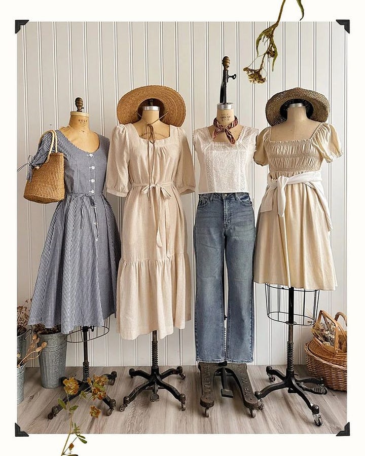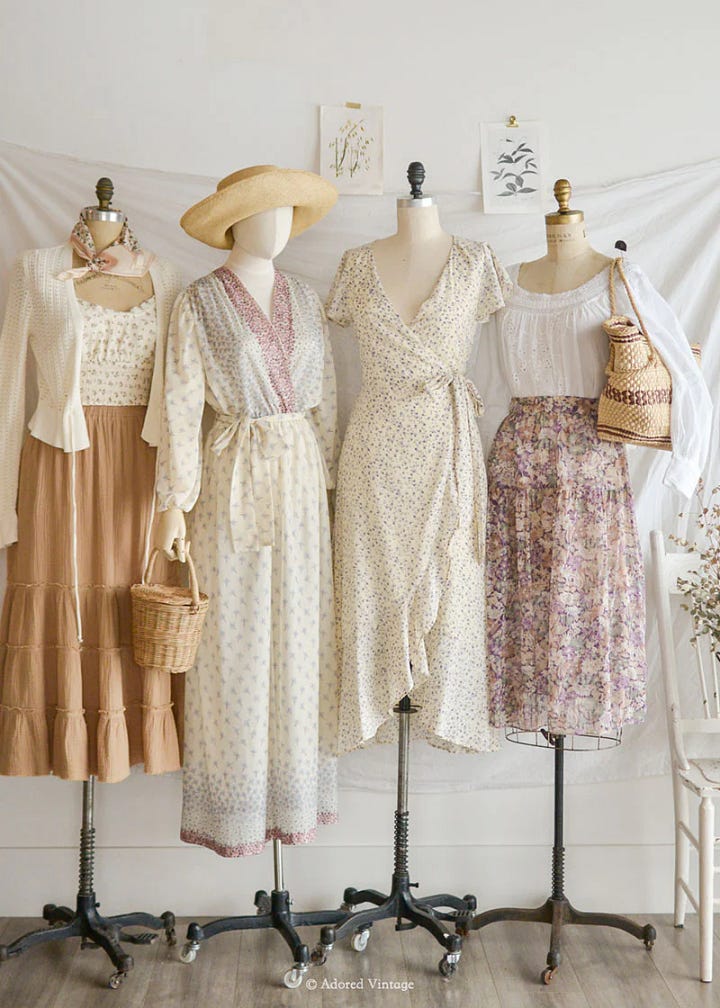 Cottagecore/Pastel Phase. Heavily influenced by the beautifully curated shop Adored Vintage, I really tried on the whole Cottagecore/Prairie Muffin look. I filled my wardrobe with dresses in soft colors, adorned with sweet florals, ruffles and ribbons. Unfortunately, these lovely clothes were highly impractical for my actual life, and everywhere I went, I felt like I was playing a character, instead of myself.