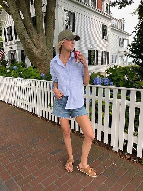 Light denim. Jeans and shorts. Frayed hems and maybe a hole or two. Casual, but nicely fitting. Classic cuts like a straight leg.